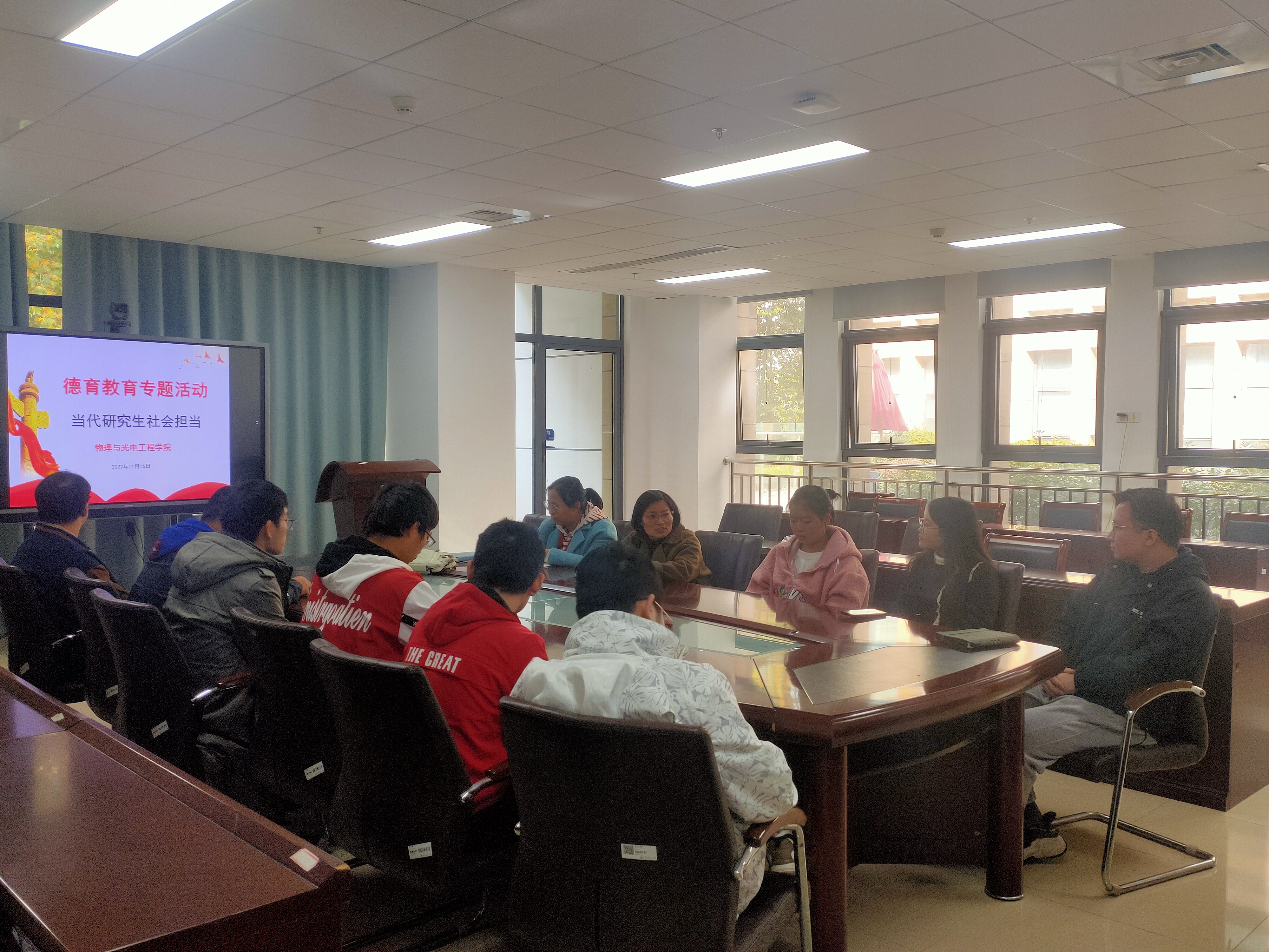 为进一步落实学校研究生德育辅导员工作制度,提升学院研究生思政教育工作实效,11月16日,yd云顶集团官网在藕舫楼330会议室召开研究生德育教育主题座谈会,师生热议“当代研究生社会担当”。学院2021级研究生德育辅导员杨翠红老师、助理德育辅导员陈云云老师及2021级全体研究生参加会议,畅谈体会。会议由研究生教务秘书张佳欣主持。